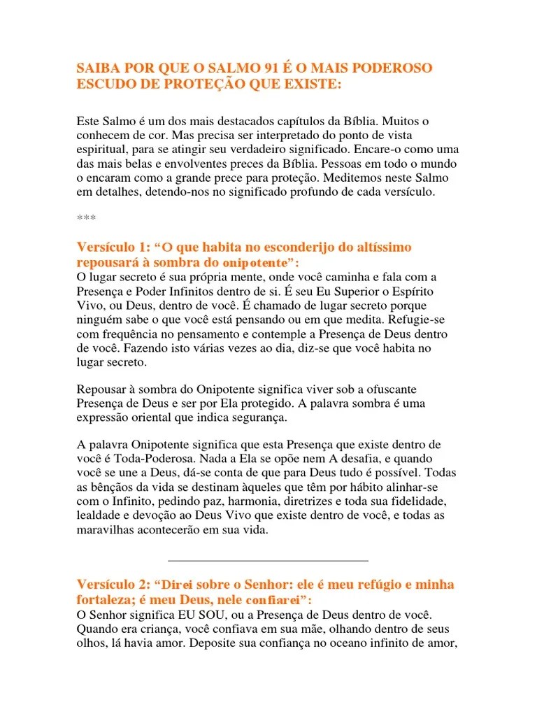 14/7/2018 · el salmo 91 es la es la mas poderosa oración de protección y provisión creada, y es conocida como la oración más bella y hermosa de la biblia.los salmos mas. Está claro que la protección de dios a los que se acercan a él estaba centrada fundamentalmente en la mente del autor. Este es un salmo que habla directamente a los temores de cada persona y su necesidad de protección y seguridad. Tú que habitas al amparo del altísimo, que vives a la sombra del omnipotente, di al señor: Declaro lo siguiente acerca del señor:2 diré yo a jehová: